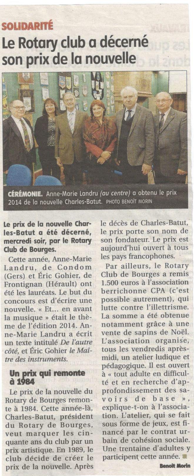 Mercredi 17 décembre, nous recevions l’une de nos lauréates dans une ambiance chaleureuse. Anne Marie Landru a en effet reçu le 2 e prix de notre célèbre concours de Nouvelles. Le thème en 2014 était » et en avant la musique ».