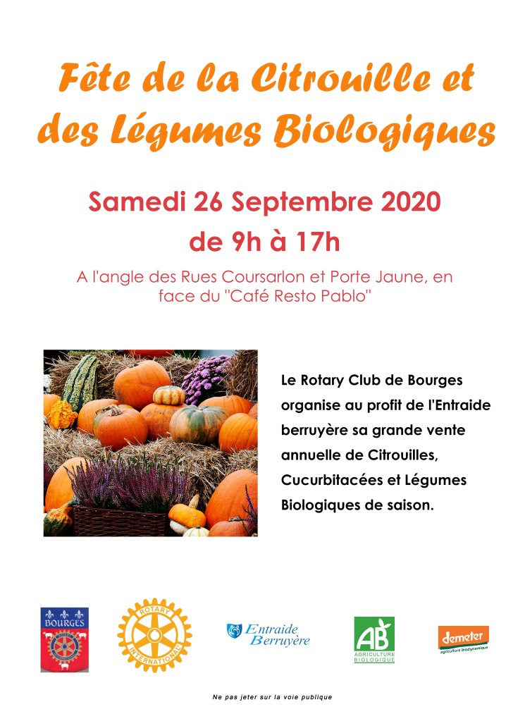 Le Rotary Club de Bourges organise depuis de nombreuses années cette fête de la citrouille et vous attend nombreux le samedi 04 octobre à l’angle de la rue Mirebeau et de l’abbé Berthaut, à proximité d’Avaricum. Venez faire le plein de légumes entre 9 h à 17h.